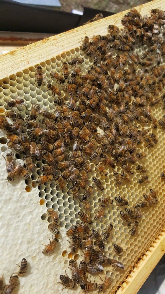 Our nucleus colonies are made up of 4 deep frames of bees, brood, honey and pollen. A young, laying and mated queen will be in each nuc. You will receive the nuc in a cardboard transport box that is only used for temporary accommodations. We recommend transferring the nuc to a full Langstroth hive as soon as possible. The nuc will build up quickly on a nectar flow or by being fed.